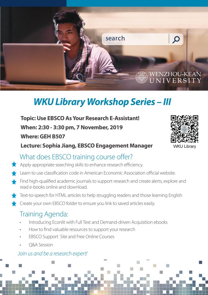 Aiming at helping our patrons gain familiarity with databases provided by Wenzhou-Kean University (WKU) Library, WKU Library has been cooperating with providers of databases to launch series of workshops. The WKU Library Workshop Series III is EBSCO training.