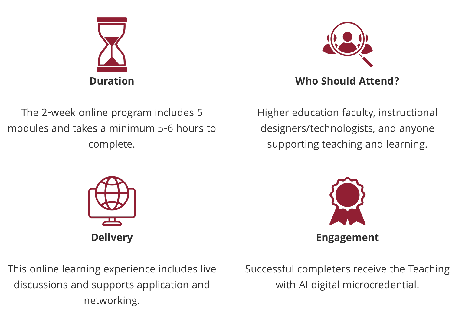 “人工智能教学”是一个为高等教育教师、教学设计师和支持人员量身定制的引人入胜的在线课程,旨在加深参与者对人工智能的理解,并使他们能够将其无缝地融入课程。它以现场讨论会为特色,为提高学生参与度、个性化学习体验和改善教育成果提供实用策略。参与者将探索现实世界的人工智能应用,参与互动活动,并与同龄人合作,为他们的教学实践开发可操作的见解。