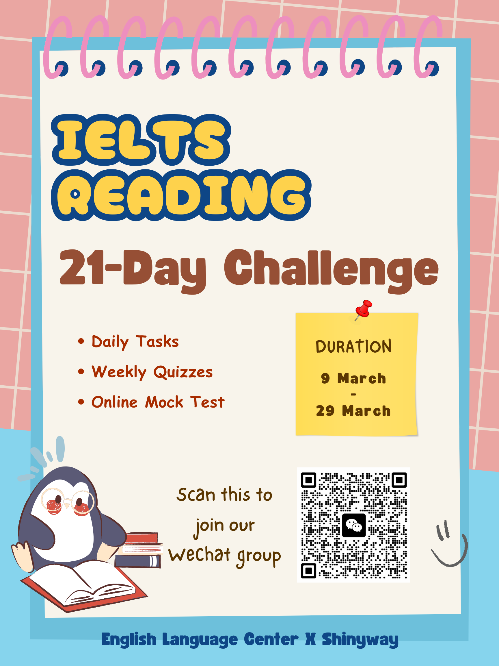 英语语言中心与新通教育联合推出“21天雅思阅读打卡挑战”活动。本次活动将建立微信群,每日统一发布阅读任务,通过群内问答及每周复习测验,帮助大家深入理解阅读文章,巩固重难点词汇。