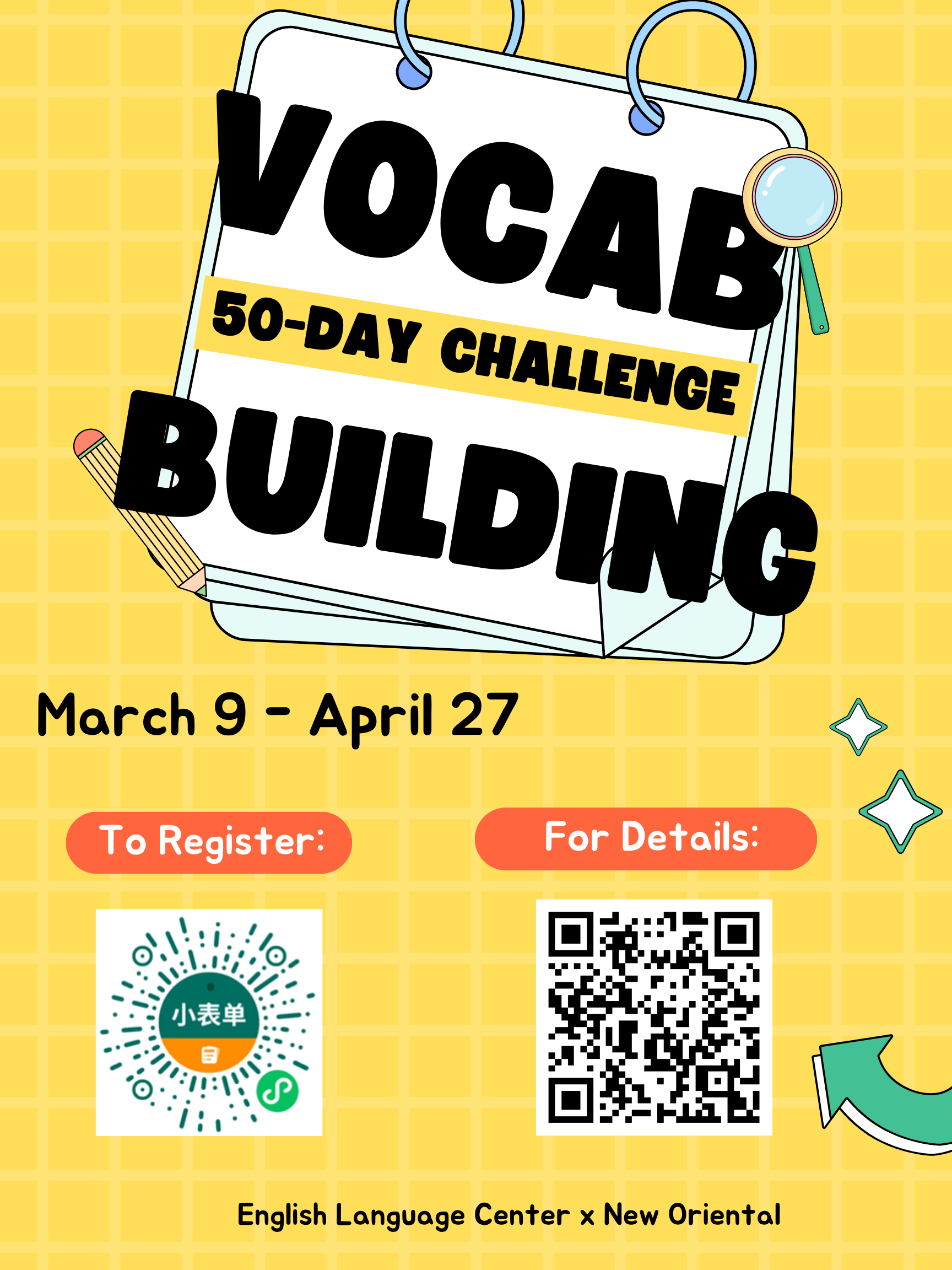你是否也曾立下flag要每天背单词,却总是半途而废?英语语言中心(ELC)联合新东方教育正式推出 「词」海扬帆——50天英语词汇挑战活动!诚邀你的参与,让我们一起用50天时间,养成每日学习的好习惯,系统掌握雅思核心词汇,赢取精美奖品!